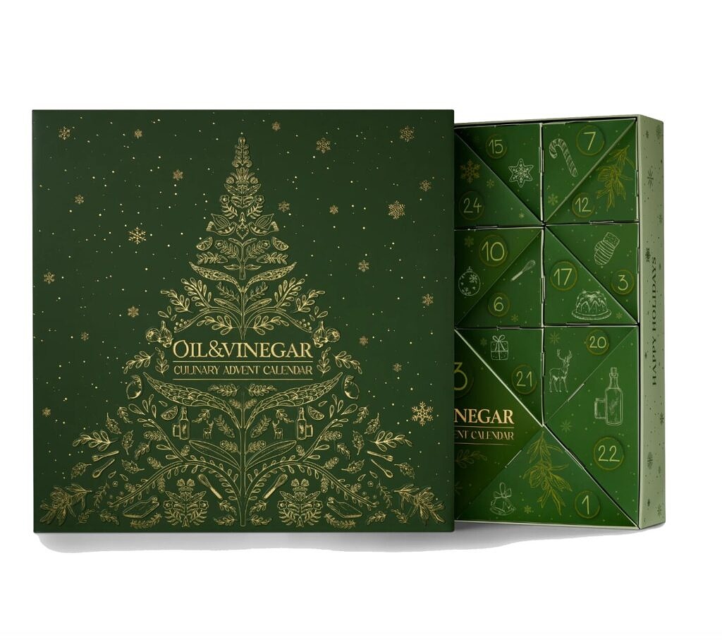 Achter elk van de 25 feestelijke vakjes een nieuwe smaak: van de hoogste kwaliteit extra vierge olijfolie en bijzondere balsamicoazijn tot verfijnde kruidenmixen en tapenades. Een heerlijke culinaire kalender t.w.v. €129,-