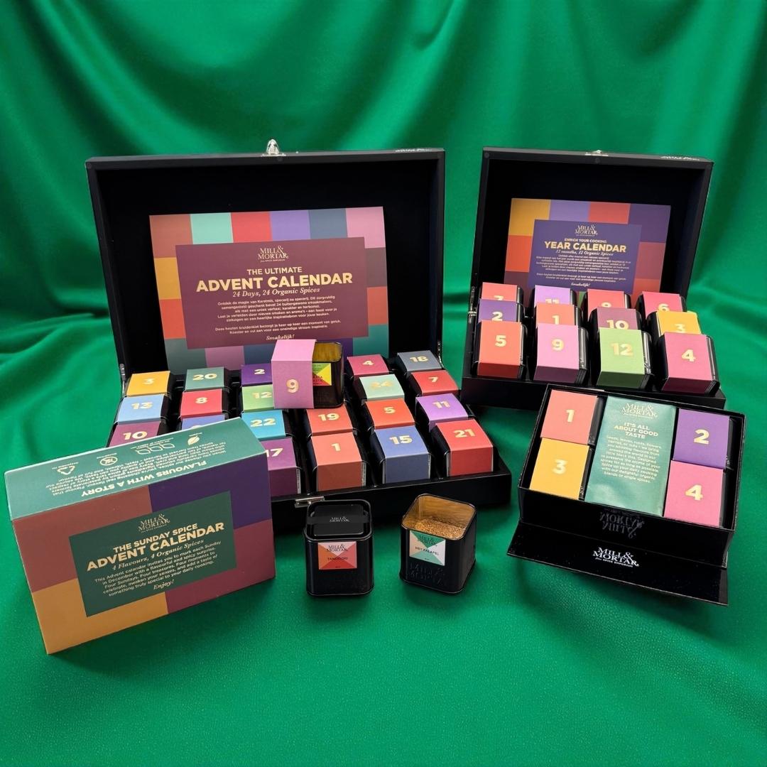 12 vakjes met de typische Mill & Mortar tinnen blikjes gevuld met kruiden, specerijen en blends. Er is ook een variant met 4 (goedkoper) en een versie met 24 blikjes (de duurste).