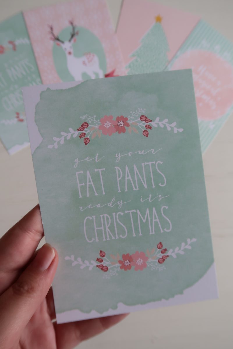 Louisette van Little Lefty Lou ontwerpt de prachtigste kaarten en je vindt ze in haar Etsy-shop. Verwacht veel decoraties in watercolor, lieve pastels, felle kleuren en leuke lettertypes. Haar kerstkaarten voor dit jaar zijn lief dankzij de zachte pastels. En vooral de kaart “Get your fat pants ready, it’s Christmas” vind ik briljant!