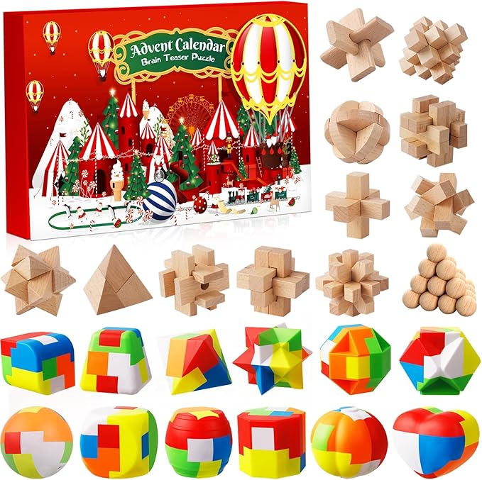 In deze adventskalender vind je 24 3D houten puzzels, sommige in kleur en sommige neutraal hout. Ze zijn leuk voor tieners en volwassenen.