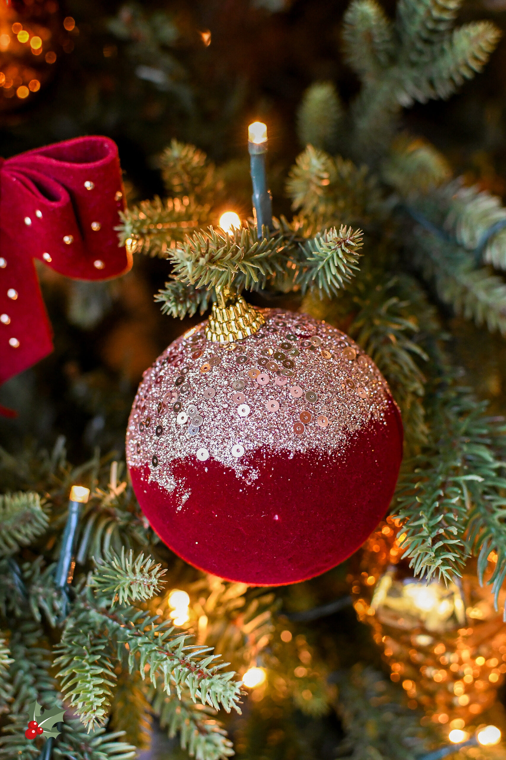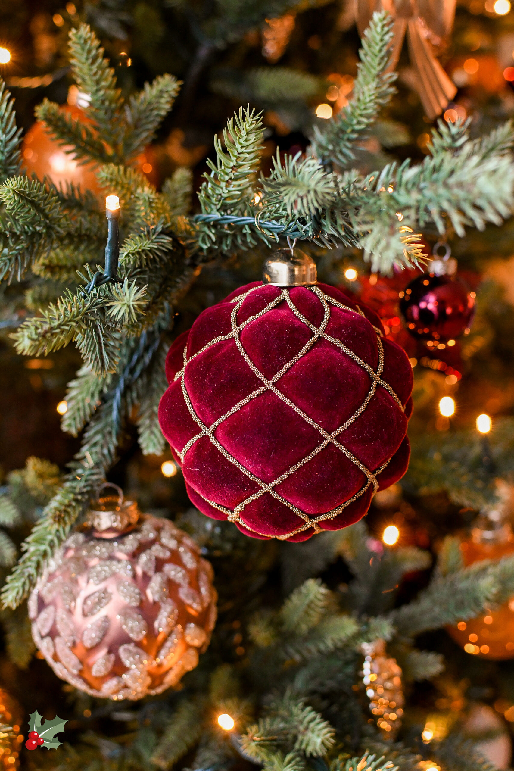 Bij The Christmas Shop vond ik de prachtige bordeauxrode ‘druiven’ met glinsterende steentjes en glitterende blaadjes die echt perféct passen bij het thema. De andere twee kerstballen die ik als ‘opvallers’ heb gekozen, zijn voorzien van een fluwelen laagje. Love it! De rest van de kerstboom is ‘ingekleurd’ met voornamelijk ‘opvullers’ – rustigere kerstballen in mijn kleurenpalet. Naast bordeauxrood (kerstballenkleur: ossenbloedrood) heb ik ook espresso, warm cider, goud en een heel klein beetje wolwit toegevoegd.
