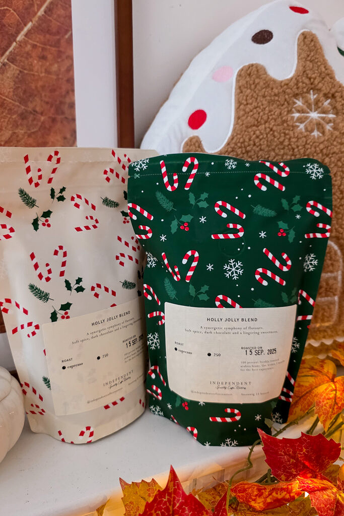- twee zaken heerlijk geurende koffiebonen in mooie kerstverpakking (€17,98) met vrolijke candy canes van Independent Coffee Roasters uit Sittard