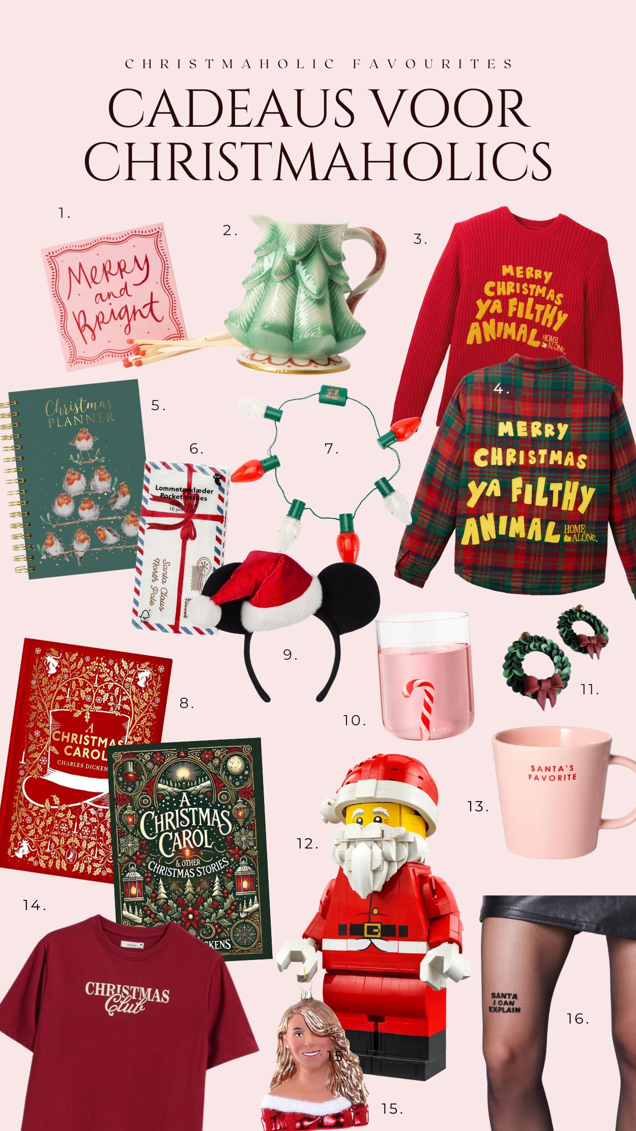 Ik heb 16 cadeau-ideetjes verzameld voor echte Christmaholics. Onder de collage vind je een genummerde lijst met wat meer informatie over elk cadeau, zoals de prijs en waar je het kunt kopen. En wellicht zijn de specifieke items op de collage niet precies wat je zoekt. Iedereen is immers anders. Maar ze zouden je zomaar kunnen inspireren tot een idee voor een cadeautje dat wel precies past bij jou of de persoon voor wie je op zoek bent!