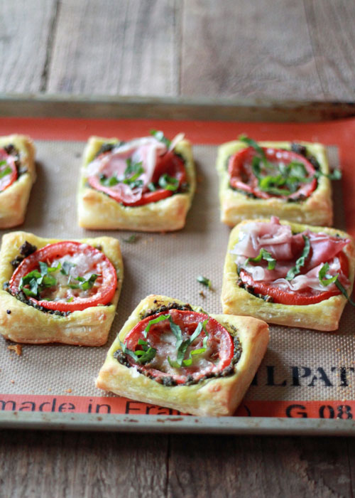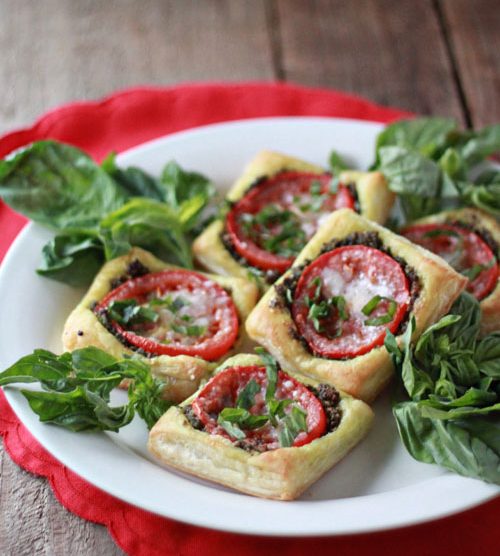 Gosh, dit ziet er ook al zo lekker uit. De basis is een taartje van bladerdeeg en daarop ligt een heerlijke zelfgemaakte pesto, een schijfje tomaat en nog wat verse basilicum. Het complete recept vind je op Kitchentreaty.com. Lekker smullen maar!