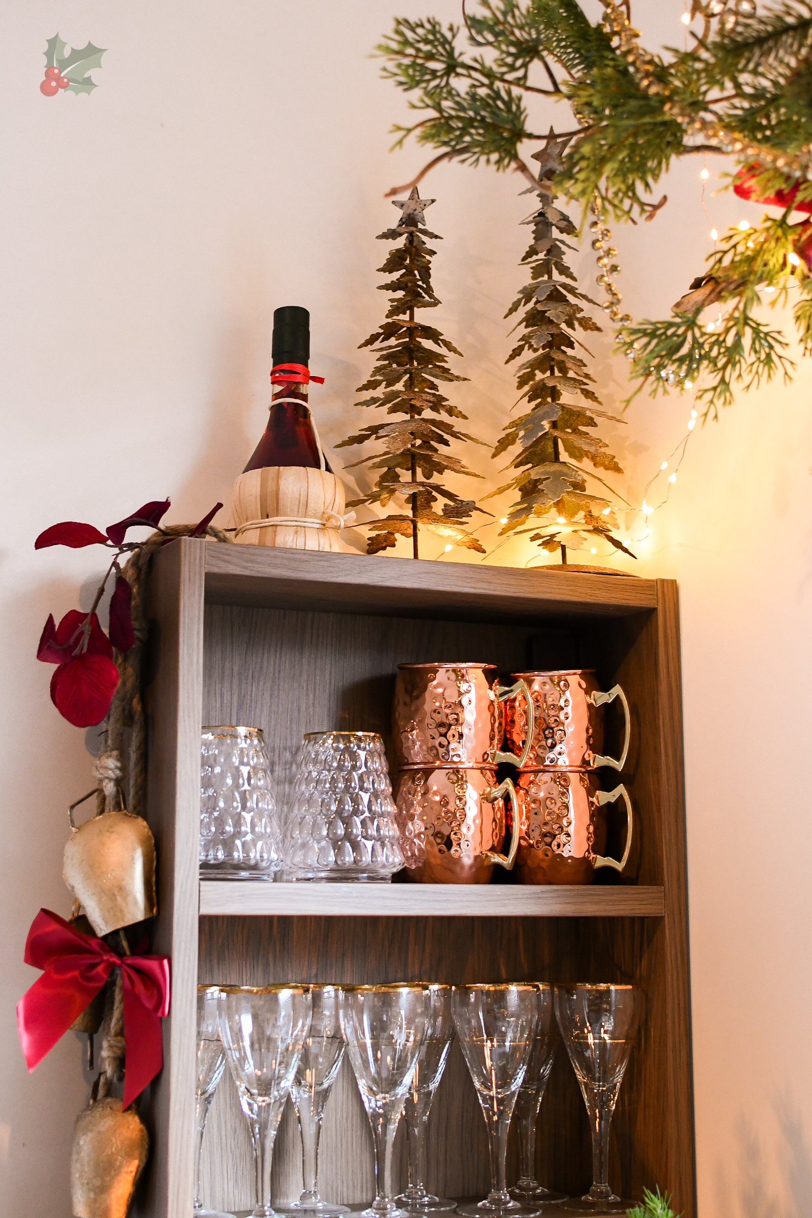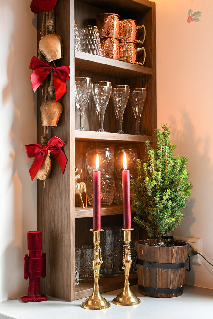 Het kastje op ons aanrecht is eigenlijk een IKEA-kastje van de badkamerafdeling, maar ik gebruik het als glazen- en mokkenkastje. Hij neemt weinig plek in beslag en levert wel een boel extra opbergruimte in onze mini keuken. En – ook niet onbelangrijk – het is weer iets leuks om te stylen en te decoreren! Ik heb er mijn kerstglaswerk in gezet (allemaal oud, van eerdere jaren) en een set vintage wijn/portglaasjes die ik scoorde via Instagram. Er hangt een slinger met koeienbellen aan en wat mooie strikjes. De twee kandelaars met bordeauxrode zijn ook vintage!