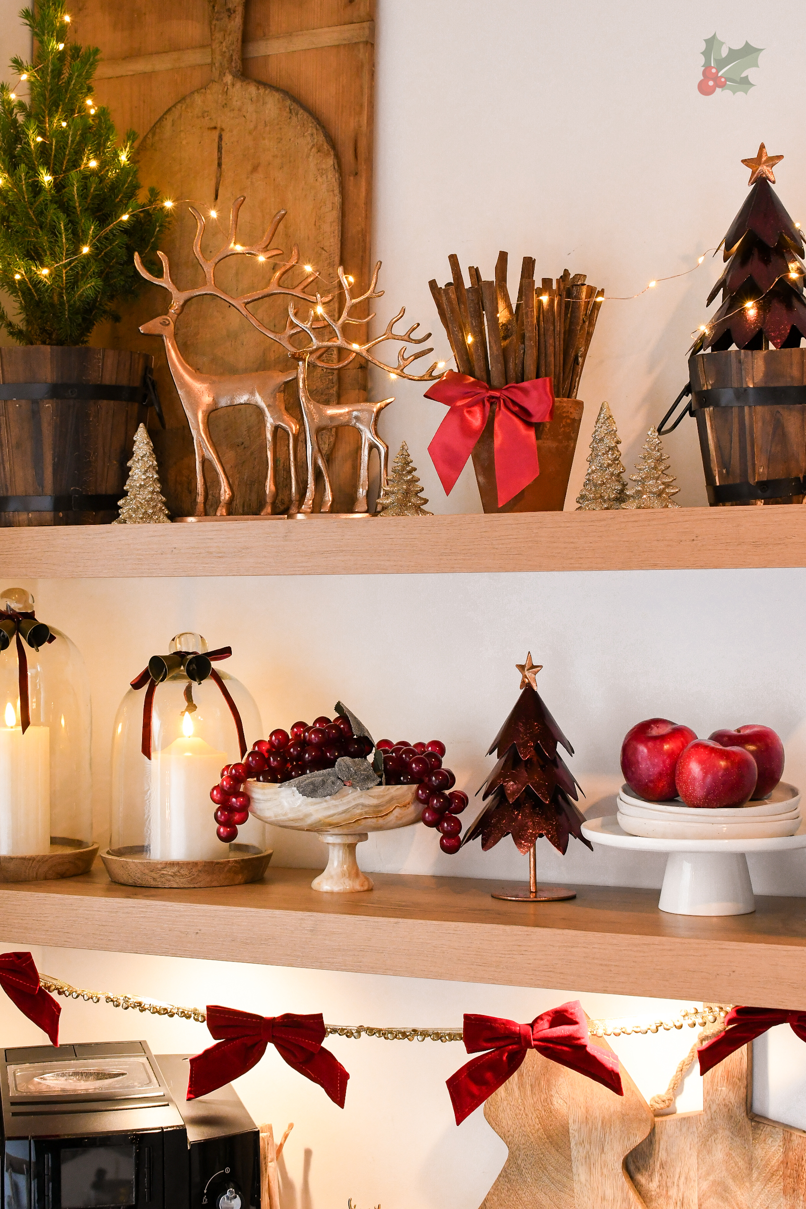 De twee plankjes boven het aanrecht in de hoek heb ik aangekleed met een boompje in ‘wijnvat-bloempot’, koperkleurige herten, een terracotta potje met decoratieve kaneelstokken, een vintage stenen schaal met ‘druiven’ (zijn kerstornamenten van Kurt S. Adler). Verder staan mijn stolpen met LED-kaarsen er natuurlijk en ik heb twee kleine boompjes gekocht (bordeauxrood met koper) in het tuincentrum die ook perfect passen hier. Aan de onderste plank heb ik – met behulp van twee plakhaken – een guirlande met fluwelen strikjes gehangen. Gecombineerd met een slinger met belletjes (dezelfde als die aan de takken voor het raam hangen).