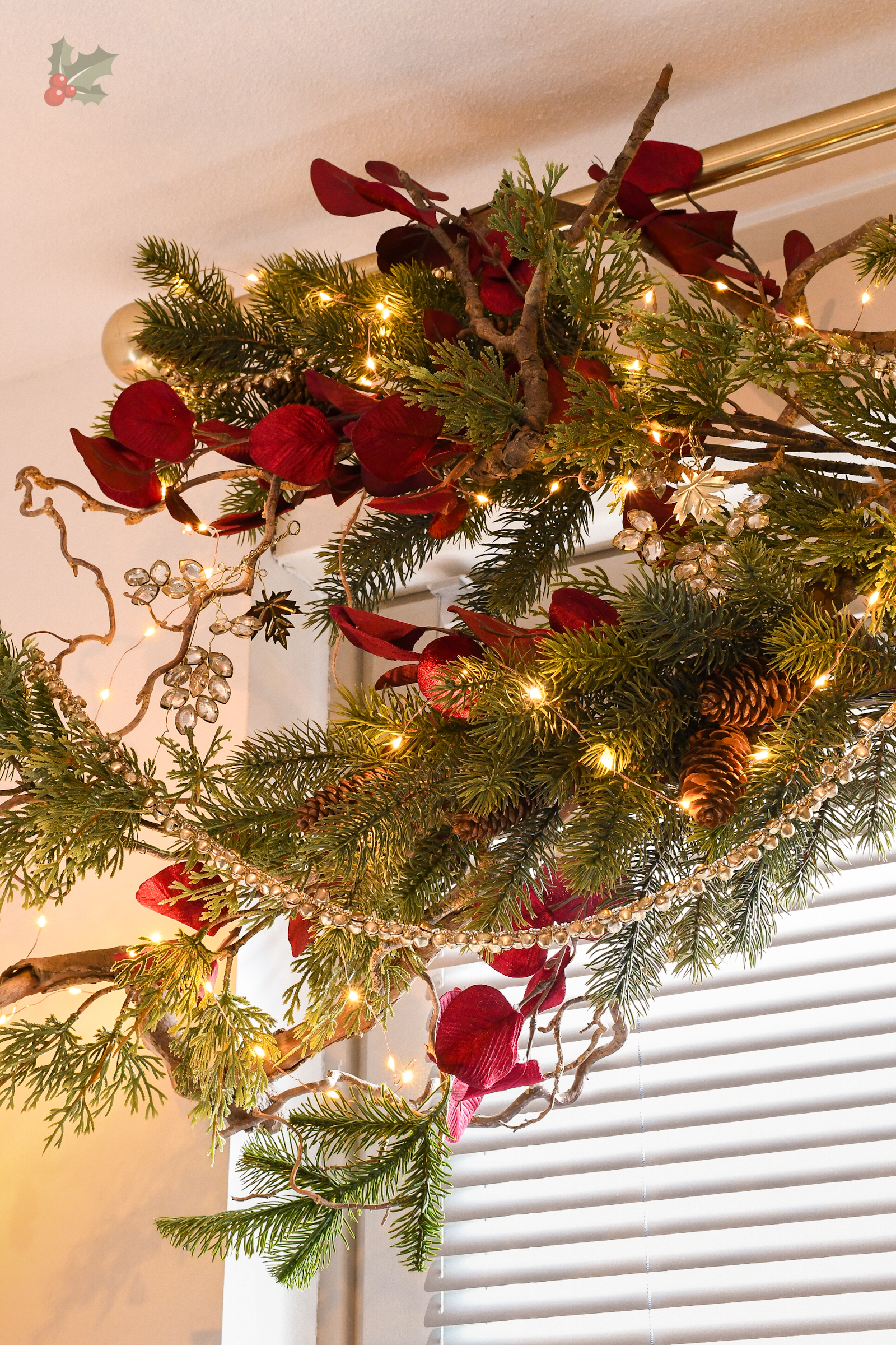 Twee jaar geleden heb ik voor het eerst een goudkleurige douchegordijnstang opgehangen in de opening van onze woonkamer naar de keuken. En dit jaar mocht ie weer terugkomen. Ik heb er guirlandes aan gehangen en lampjes. Op de markt vond ik een mooie lap bordeauxrode stof in de koopjeshoek (6 meter voor 6 euro, goeie deal hè?). Die heb ik gedrapeerd over de stang en rond de guirlandes. Ik heb wat van deze plakhaken vastgemaakt op de muur en daar heb ik de guirlandes in gehaakt, zodat ze strak langs de muur hangen en zodat de stof mooi valt. Tot slot moest er in het midden (aan beide kanten) natuurlijk een grote strik komen! In deze blog lees je nog meer over het ophangen van kerstdecoraties zonder boren of schroeven.