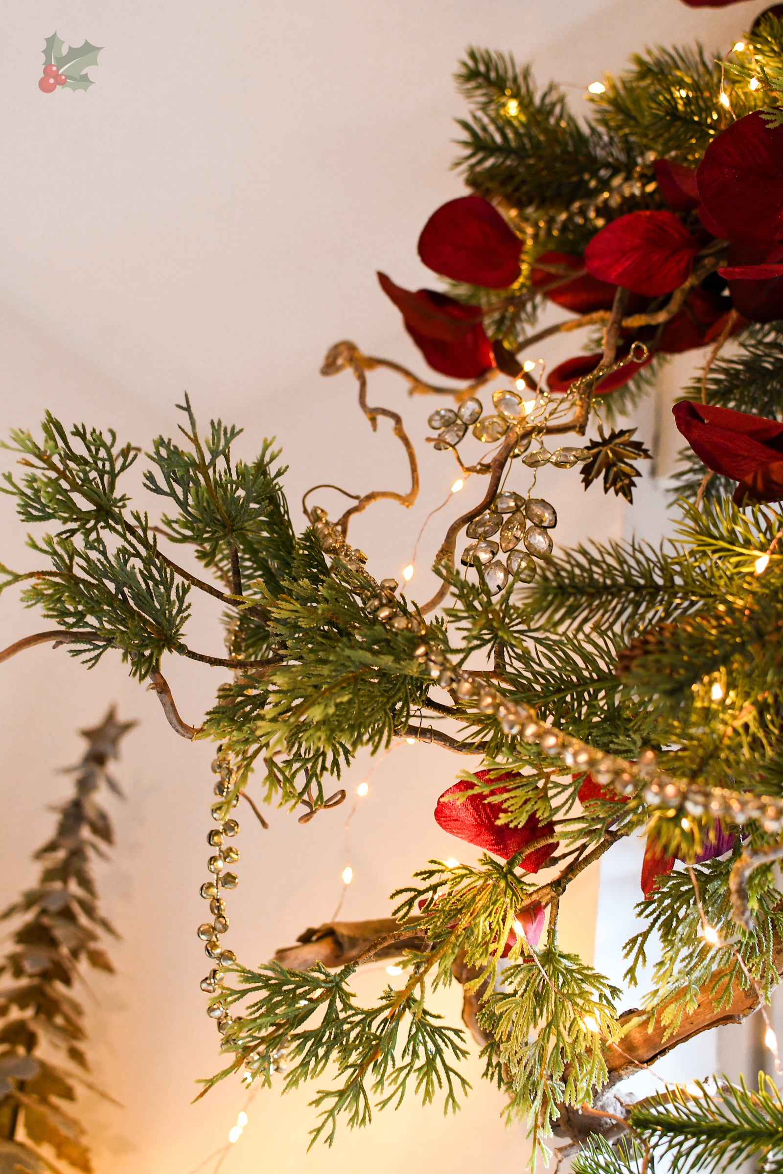 Boven ons keukenraam hangt een roede waar het hele jaar door takken aan hangen. Ik heb de takken versierd met kerstgroen (gekocht bij BijSTOX in Roermond) en fluweelrode kunstbladeren (van de Primark). Er hangen wat slingers met belletjes aan (jaren oud) en wat rustige versiering met glas. Ik heb het kerstgroen trouwens bewust in een strikjesvorm aan de takken vast gemaakt, dat vond ik wel passen bij de andere strikjes in de keuken.