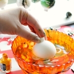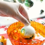 Haal de bal nu weer snel uit het water en laat hem rusten op je zelfgemaakte (piep)schuimrekje. Het is belangrijk om de bal met de opening naar beneden te laten drogen voor een mooi egaal effect. Ververs het water regelmatig en zorg dat de temperatuur goed blijft.