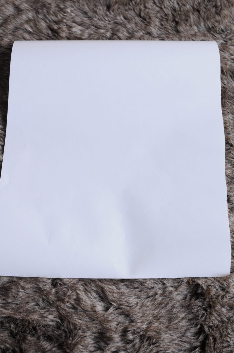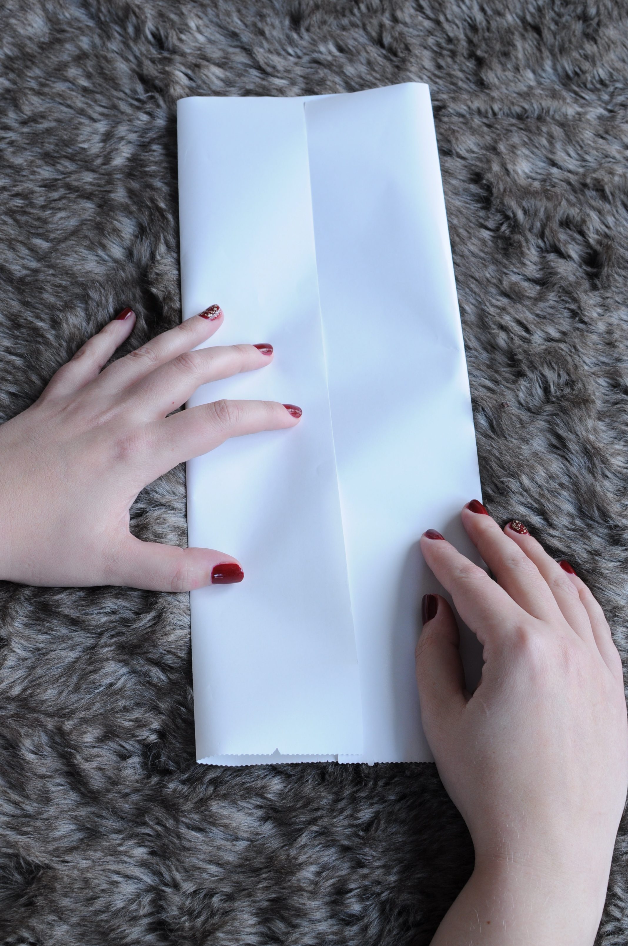 Leg je cadeaupapier plat op tafel en vouw de binnenzijden tegen elkaar aan. Plak vanaf het midden tot beneden vast met plakband. Vouw nu een stuk van de onderzijde naar boven, zoals op de foto’s hieronder, en ga met je vinger even over de vouwrand heen.