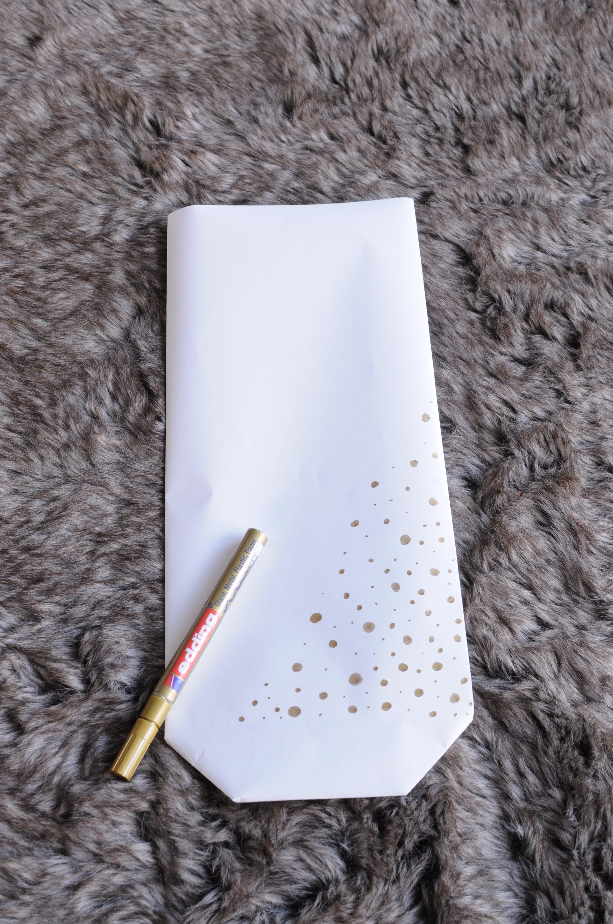 Draai het zakje om en decoreer met een stift. Ik maakte grote en kleinere stippen met een goudkleurige stift (gekocht bij Pipoos). Maar je kunt natuurlijk je fantasie de vrije loop laten! Gebruik je kraftpapier of zwart papier, dan zou je met een witte krijtstift kunnen decoreren. Gebruik je papier met een printje, dan kun je deze stap overslaan!