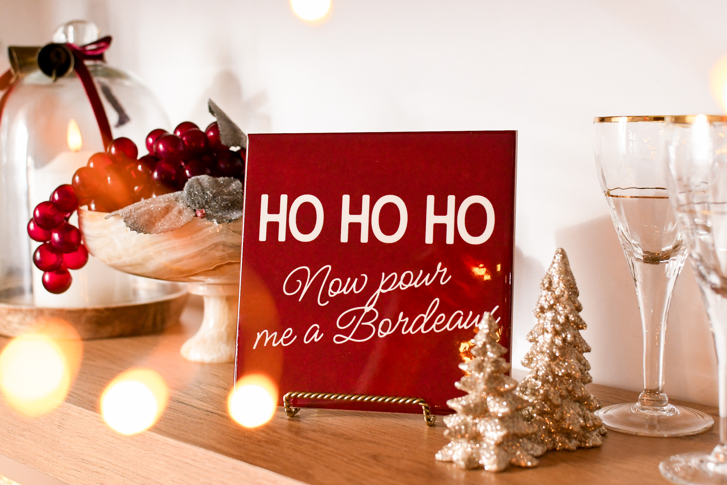 En nu ben ik aan de slag gegaan met kersttegeltjes! Wellicht heb je ze al gezien in de kerstshows, want tegeltjes zijn hot! Het is uiteraard helemaal leuk om een kant-en-klaar tegeltje kopen, maar zelf een tegeltje ontwerpen en laten drukken is nog vééél specialer. Vind ik dan hè. En dat kan dus bij Fotofabriek! Ik heb met het gratis programma Canva een vijftal tegeltjes ontworpen, die goed passen bij mijn thema en stijl. Mijn favoriet is denk ik wel die met ‘Ho ho ho, now pour me a Bordeaux’. Die past perfect bij mijn versierthema van dit jaar: Christmas in Burgundy. Die staat nu in de keuken te shinen!