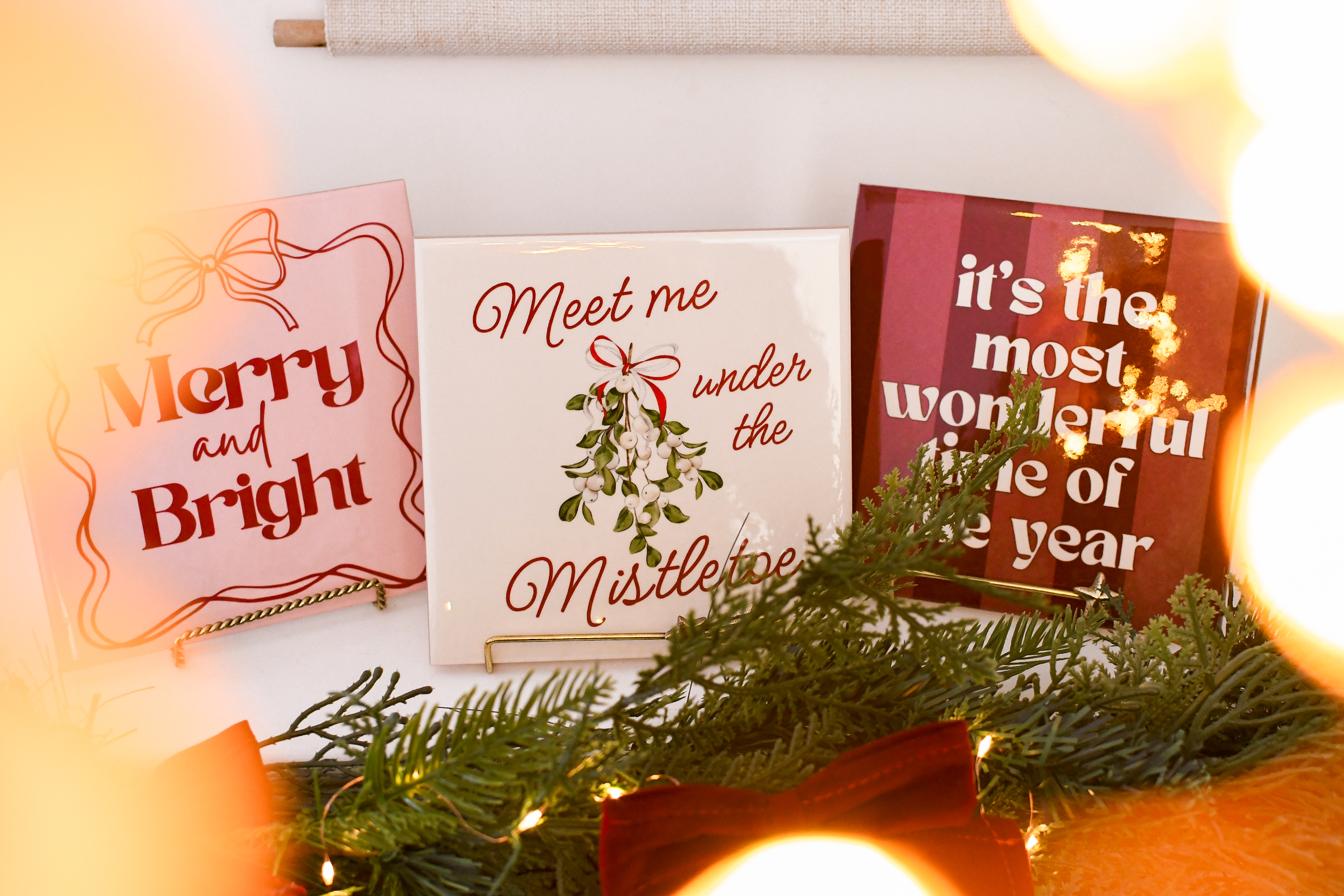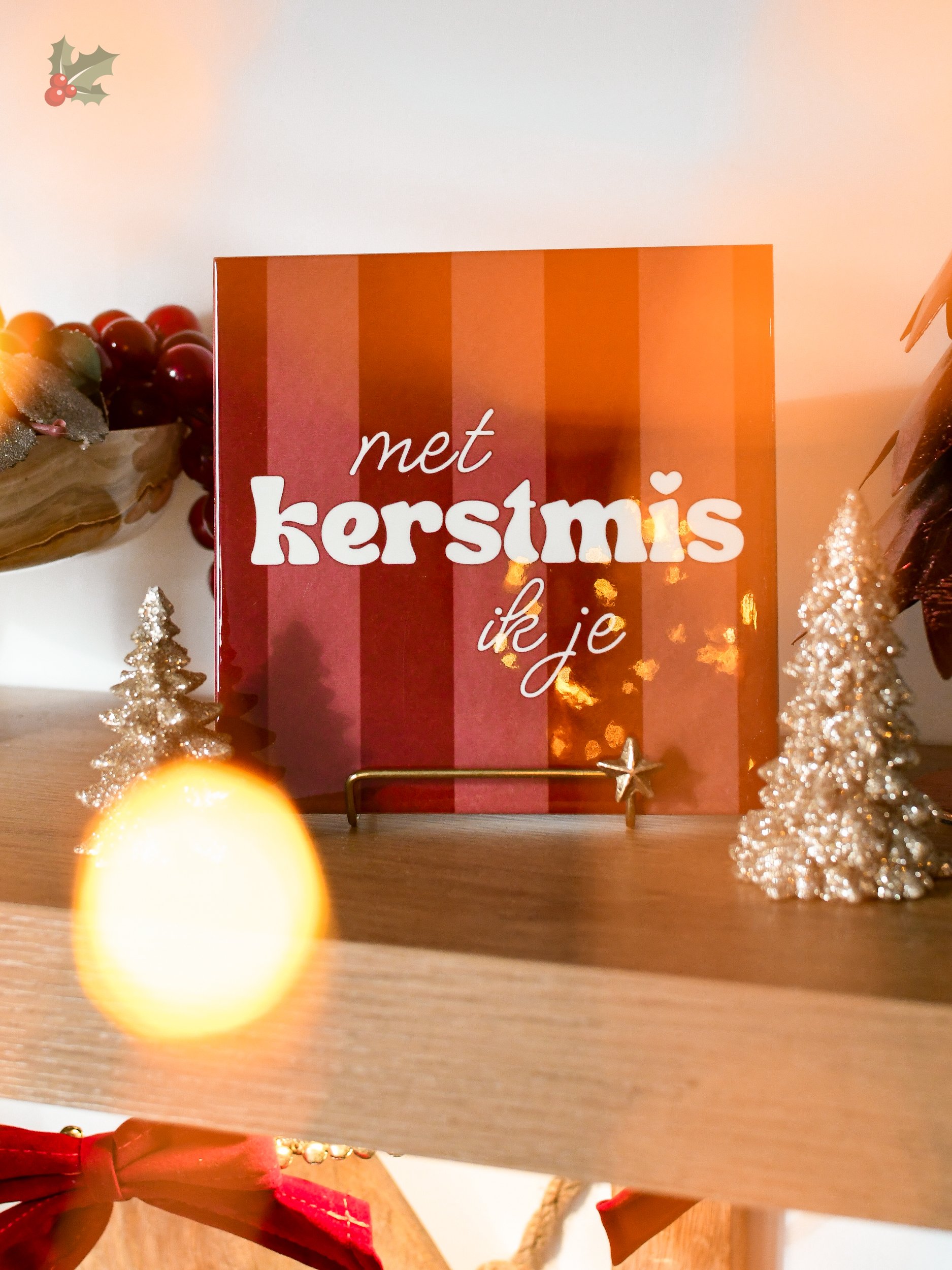 Maar ook de ‘Meet me under the Mistletoe’ en de ‘Merry and Bright’ met strikje vind ik heel erg tof geworden. Omdat ik mijn mama zo mis, heb ik ook een tegeltje voor haar ontworpen met de tekst ‘Ik kerstmis je’. Die vind ik denk ik het meest speciaal geworden. Ik heb trouwens gekozen voor het formaat 15×15 cm vierkant, maar er zijn ook hexagon (zeshoekige) en XL tegels. Ik heb daarnaast voor de HD tegel-afwerking gekozen, want dan komt er een mooie glanslaag overheen waardoor de kerstlichtjes zo mooi reflecteren.