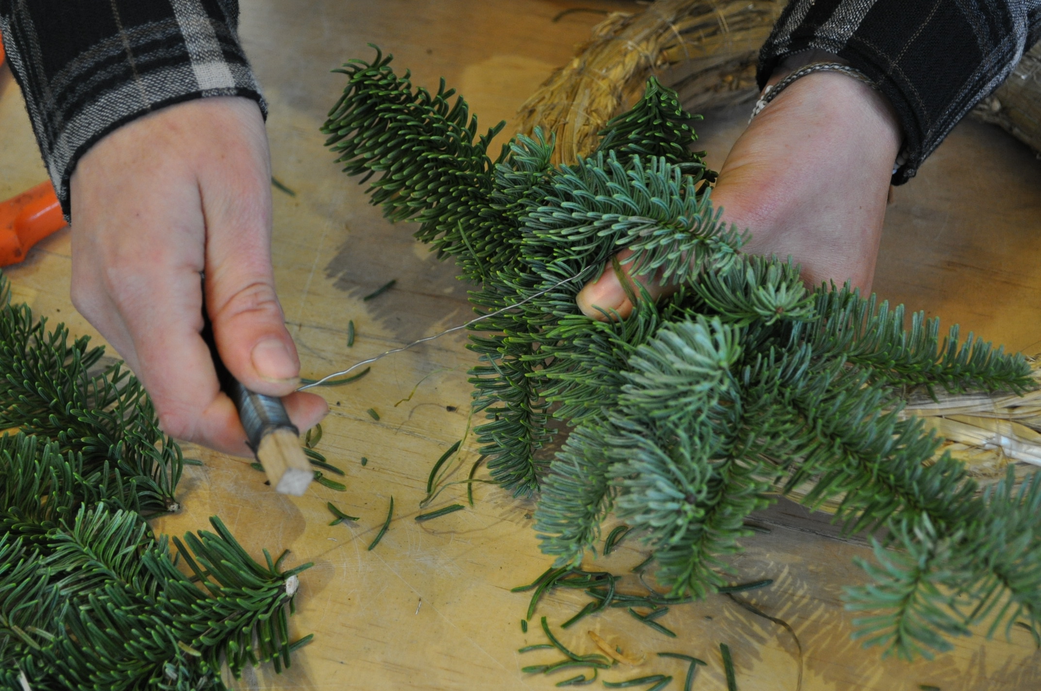 Je kunt zo’n kerstkrans natuurlijk kant-en-klaar kopen, maar het is veel leuker om het zelf te maken. Wat je nodig hebt is een rieten kransje als basis, ijzerdraad en heel veel kerstgroen. Op de foto’s hieronder zie je hoe je de krans stap voor stap opbouwt. Leg een klein takje kerstgroen op de krans en wikkel er met ijzerdraad omheen. Leg er weer een takje naast en wikkel verder. Zorg dat je ook groen langs de randen van de krans legt, niet alleen erbovenop (anders blijf je het riet zien). Als je lang genoeg doorgaat, is je krans helemaal vol met kerstgroen.