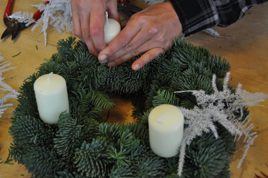 De tweede stap is het bevestigen van de kaarsjes. We hebben gekozen voor kleine stompkaarsjes in traditioneel gebroken wit. Om de kaarsen in de krans te steken, kun je een simpel trucje gebruiken. Knip twee stukjes ijzerdraad van ongeveer dezelfde lengte. Maak de uiteindes met een aansteker warm en steek ze onderin de kaars. Hou ze recht en vast tot het vet van de kaars weer gestold is. Herhaal dit voor alle vier de kaarsen. Nu kun je ze eenvoudig in de krans steken!