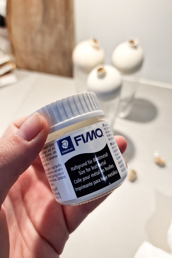 Ik heb voor deze DIY de bladgoud-lijm van Fimo gebruikt. Ook de vellen bladgoud zijn van dit merk. Ik had ze nog in huis voor een eerder project, dus ik dat was ideaal. Om het bladgoud op de kerstballen aan te brengen heb je een droge, schone en zachte kwast nodig. Dat kan een (water)verfkwast zijn, maar bijvoorbeeld ook een oude (makeup)kwast.