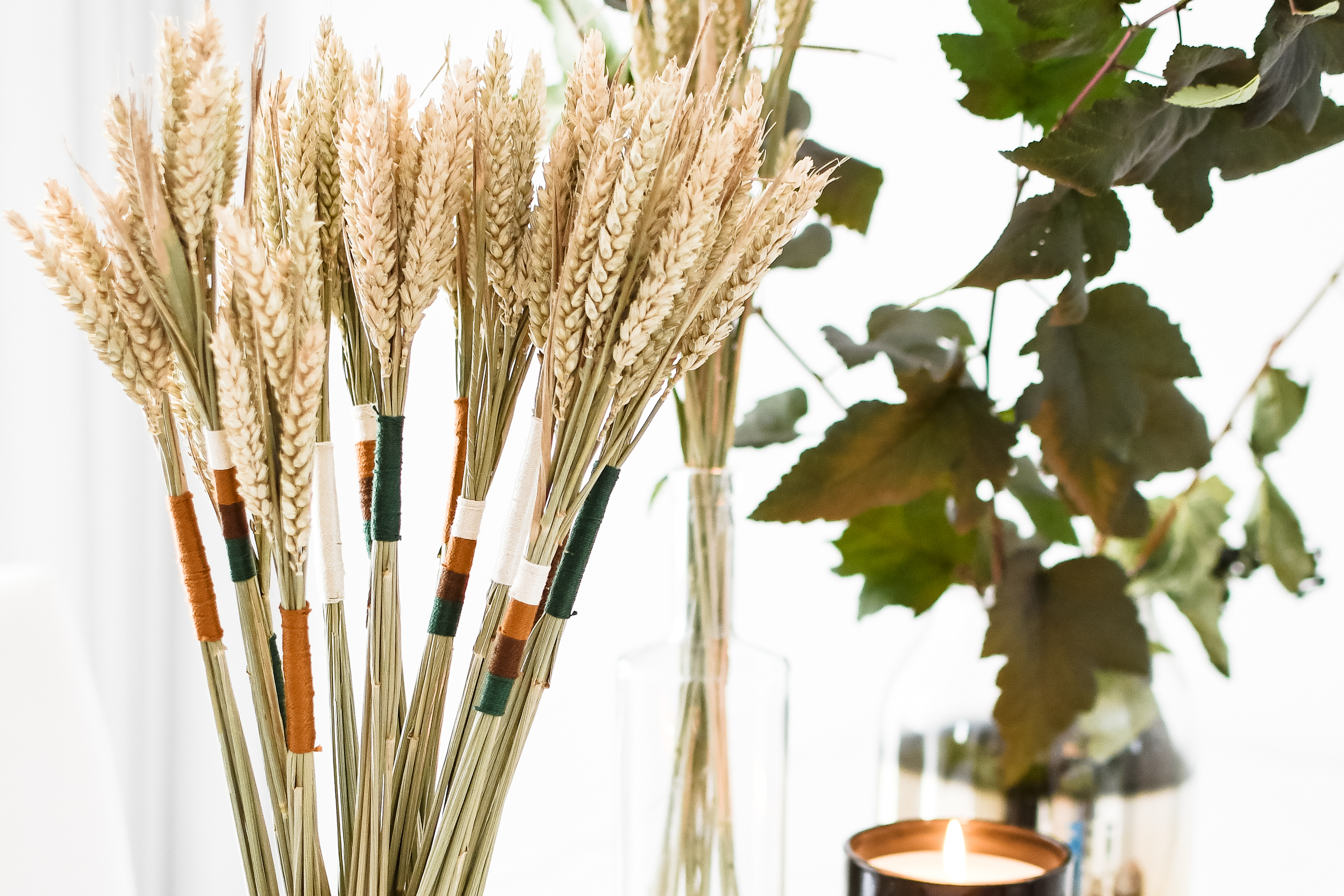 Maak voor deze herfst DIY bosjes van 3, 5 of 7 takjes gedroogde tarwe. Oneven aantallen zijn altijd het mooiste! Meer dan 7 kan ook, maar dan worden je bosjes heel dik en dat vond ik minder mooi. Haal de losse blaadjes en takjes onderaan weg zodat je de bosjes strak kunt omwikkelen.