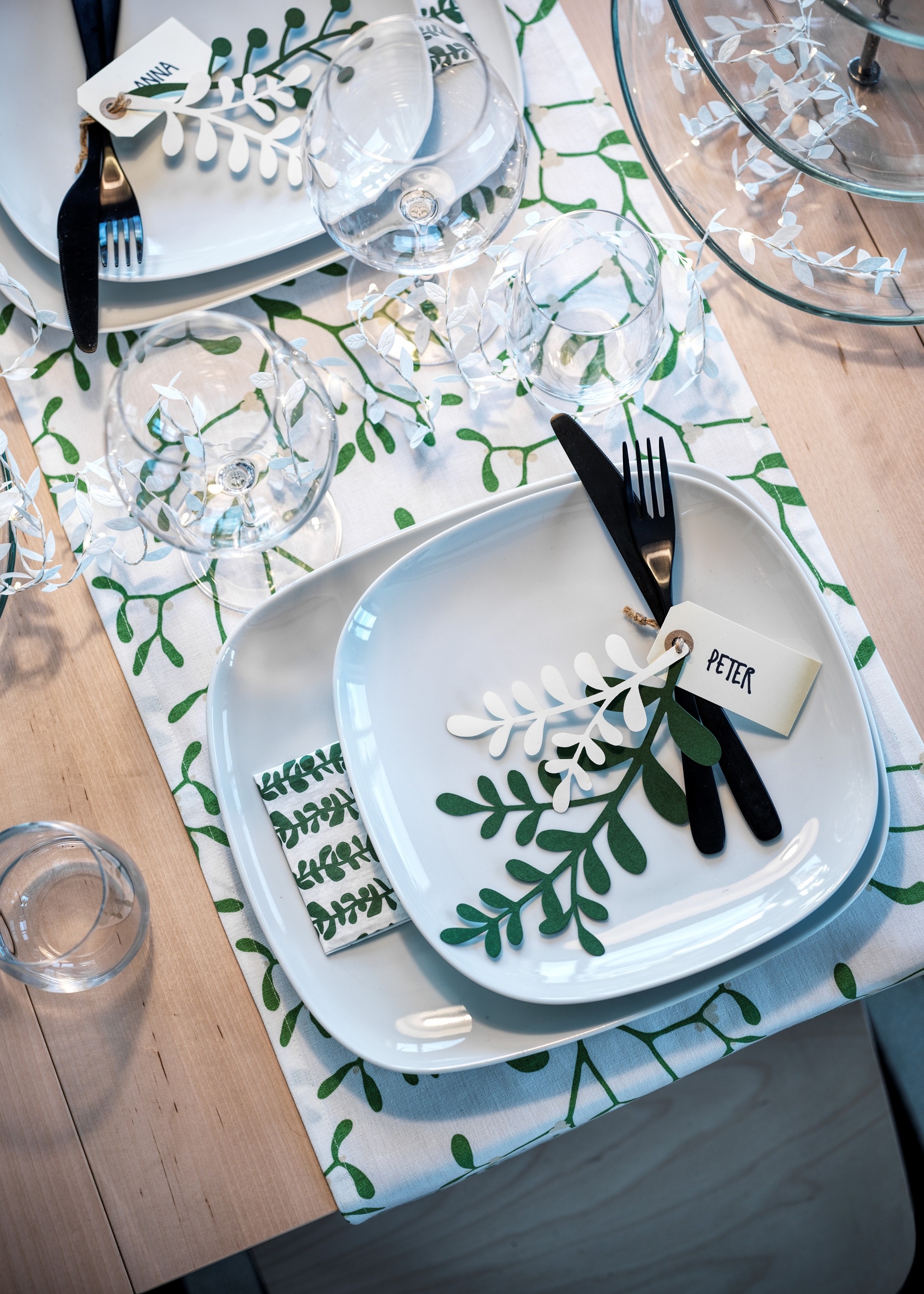 Voor het dekken van de tafel heeft IKEA altijd een serie bijzondere kerstartikelen. Dit jaar zijn er witte tafellopers met groene maretakken en ook een lichtsnoer in de vorm van blaadjes dat het perfect doet als tafeldecoratie. In het maretak-thema zijn ook speciale decoraties te koop die je aan naamkaartjes kunt bevestigen. Wereldberoemd is het VINTERSAGA gemberkoekhuisje dat je thuis zelf in elkaar kunt zetten. Tip van IKEA: maak het af met suiker en het lijkt of er verse sneeuw op de daken ligt.