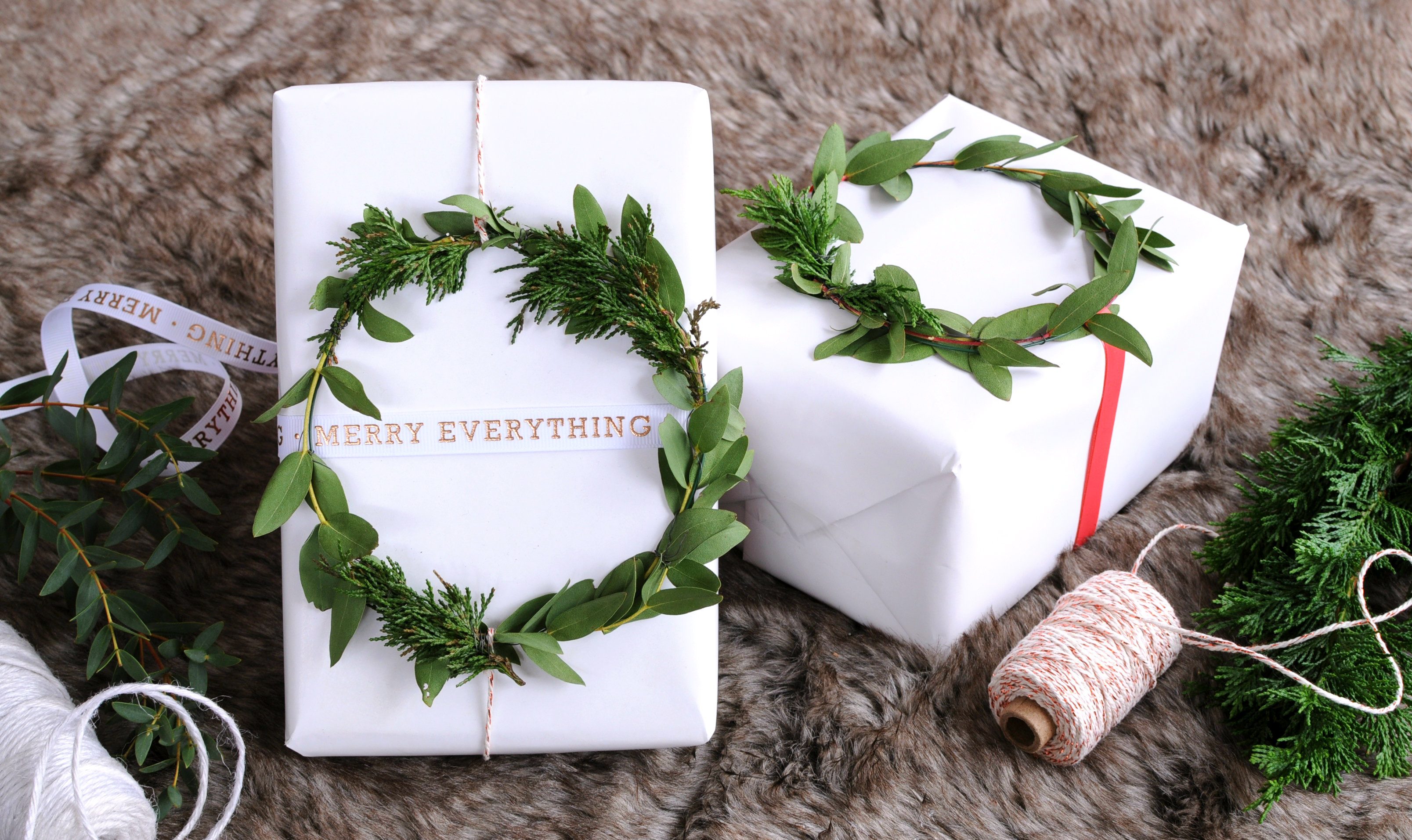Ik heb wit cadeaupapier ontdekt! Het is echt een blank canvas en je kunt er zoveel leuke en mooie dingen mee doen. In deze blog vormt het witte papier een blanco achtergrond waarop de echte kerstkransjes stralen. Zij zijn de showstoppers! Ik ga je laten zien hoe simpel het is om deze mini-kerstkransjes te maken en je kerstcadeautjes ermee te versieren.