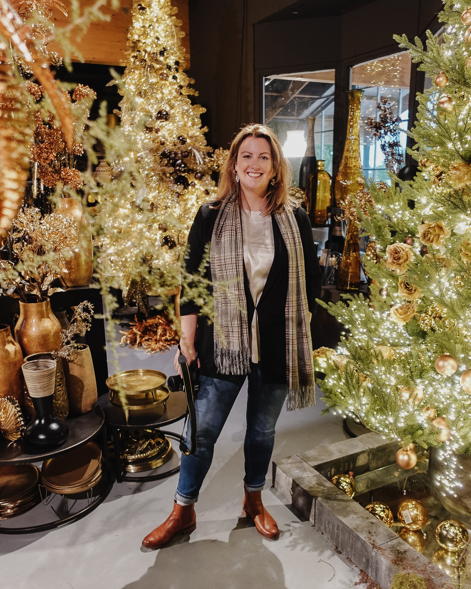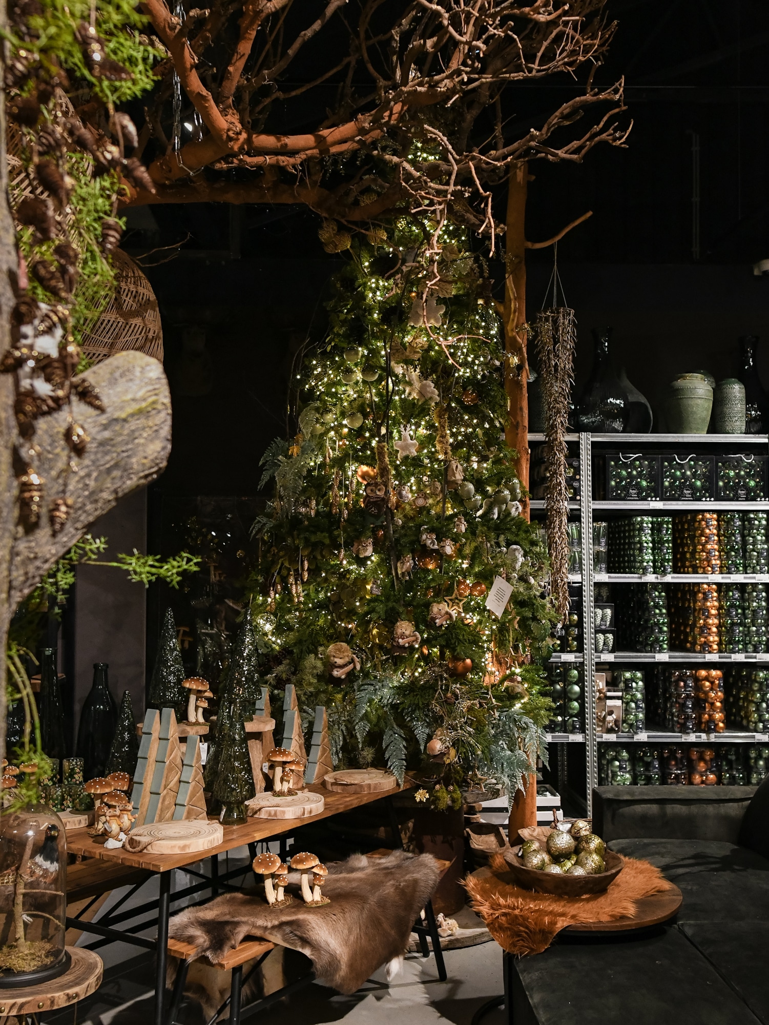 Beneden gaat de kerstshow gelukkig nog heel even verder. Er is een hoek met super romantische versieringen, in alle roze-tinten die je maar kunt bedenken. En daarna volgt mijn favoriete ruimte: die met de natuurlijke & bosachtige stijl. Er zijn versieringen in kleuren als groen, amber, bruin en goud. I lóve it. Mijn handen kriebelden om mijn winkelmandje vol te gooien. Wat een prachtige sfeer hangt hier.