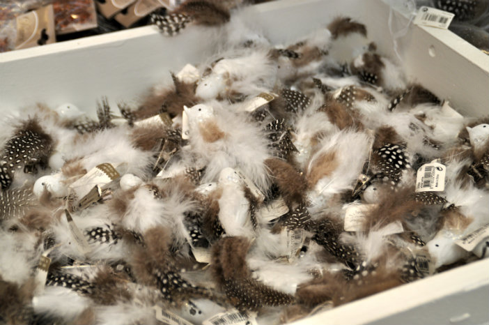 In het verlengde van dit kleurthema vol koper & blauw, is er een stijl die Tuincentrum Osdorp ‘Fluffy Feathers’ noemt. Veren zijn helemaal de trend dit jaar, en daar spelen ze in Amsterdam slim op in. Je vindt in dit hoekje tientallen decoraties in de vorm van veren of met veren erop of erin. Feather paradise, zeg ik!