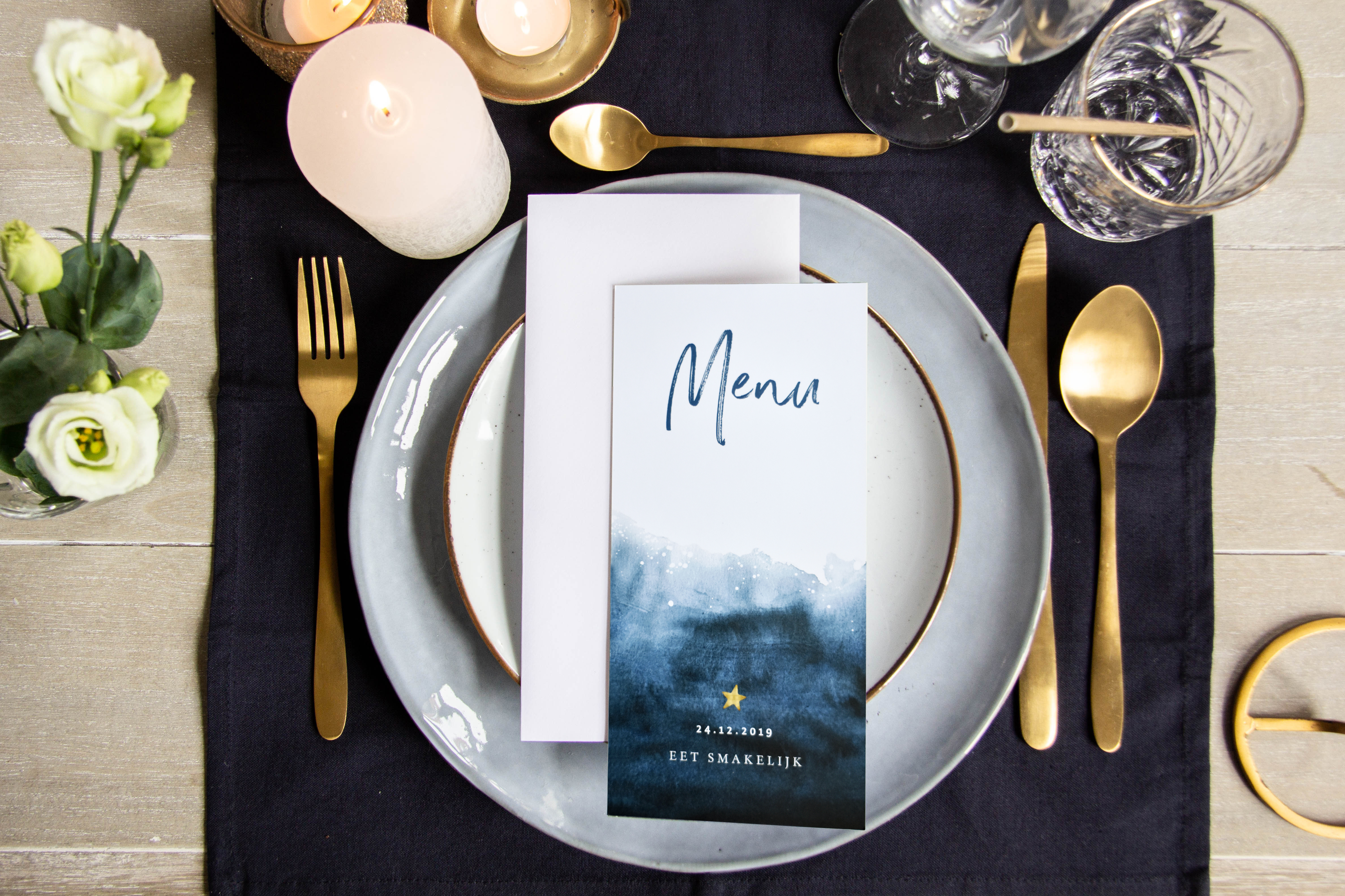 De menukaarten voor het kerstdiner kun je helemaal naar wens ontwerpen. Zet je eigen tekst op de voor- en binnenzijde. Misschien wil je wel een mooie foto toevoegen. Laat het menu er direct – in een prachtig lettertype – in drukken. Of bestel ze ‘leeg’ en schrijf het er zelf met de hand in! Het is maar net wat jij wil. De menukaarten zijn er in diverse stijlen en kleuren. Eigenlijk in alle kerstkaartentrends is er wel iets te vinden!